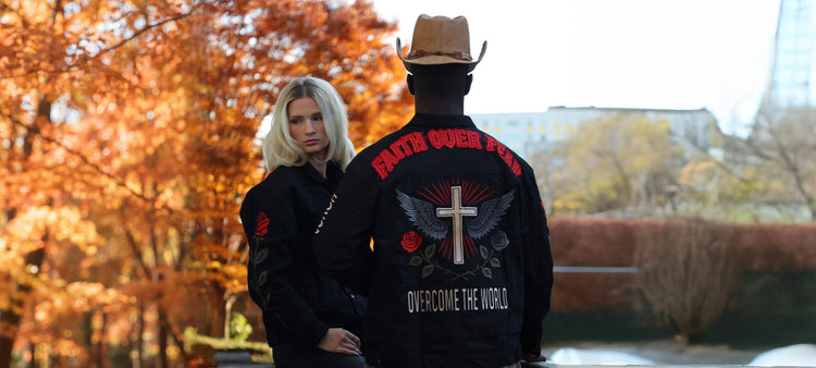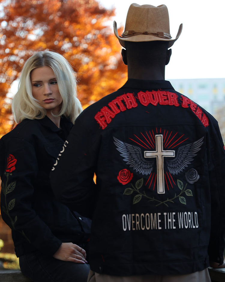 A statement of resilience and purpose, the Overcome the World Denim Jacket is crafted from high-quality black denim with bold, symbolic artwork. The back features a striking angel with wings, representing strength and guidance. The details on the sleeves add even more depth to...