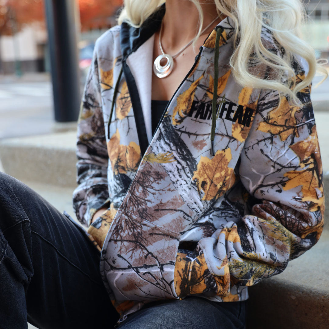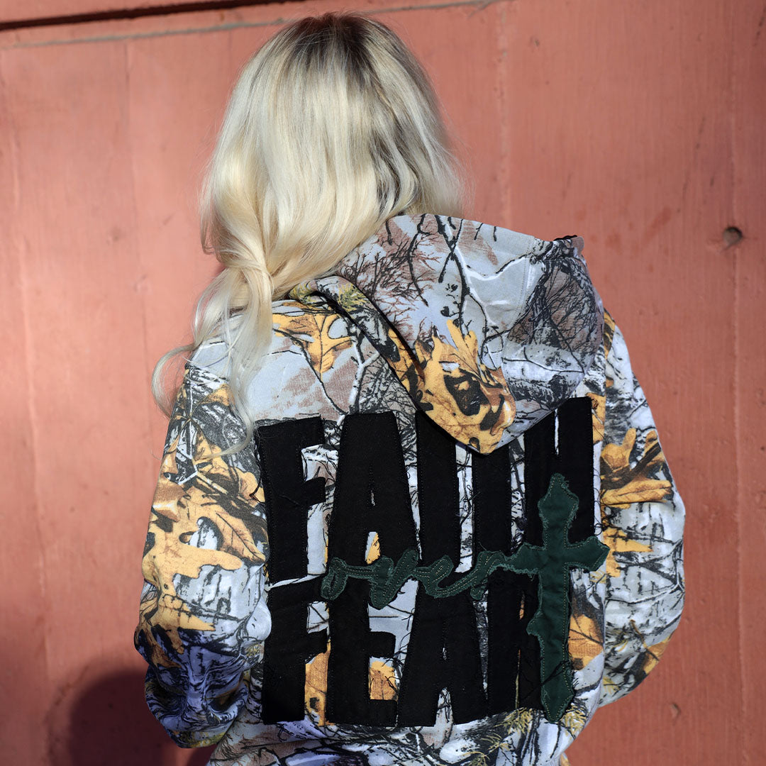 The all-over camo pattern embodies grit, resilience, and readiness — a visual reminder that you’re equipped for any season. The back features a massive FAITH OVER FEAR chenille patch, complete with a rugged green cross stitched through the design. Every detail speaks to identity, boldness, and unshakable conviction.