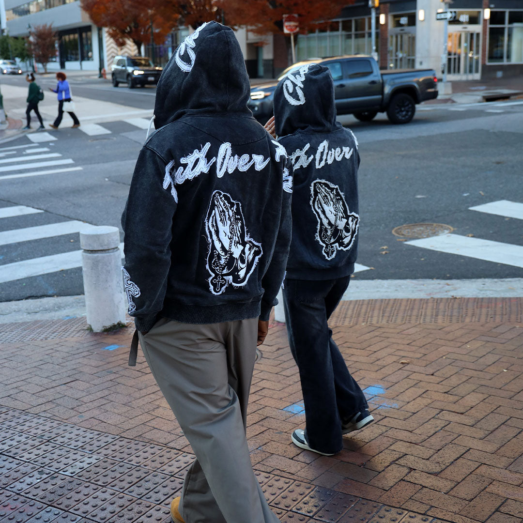 Across the back, oversized distressed chenille embroidery spells Chosen and Faith Over Fear—bold, rugged, and unmistakable. The centerpiece: a powerful white-on-charcoal patch of praying hands clutching a rosary, symbolizing covering, calling, and divine protection.