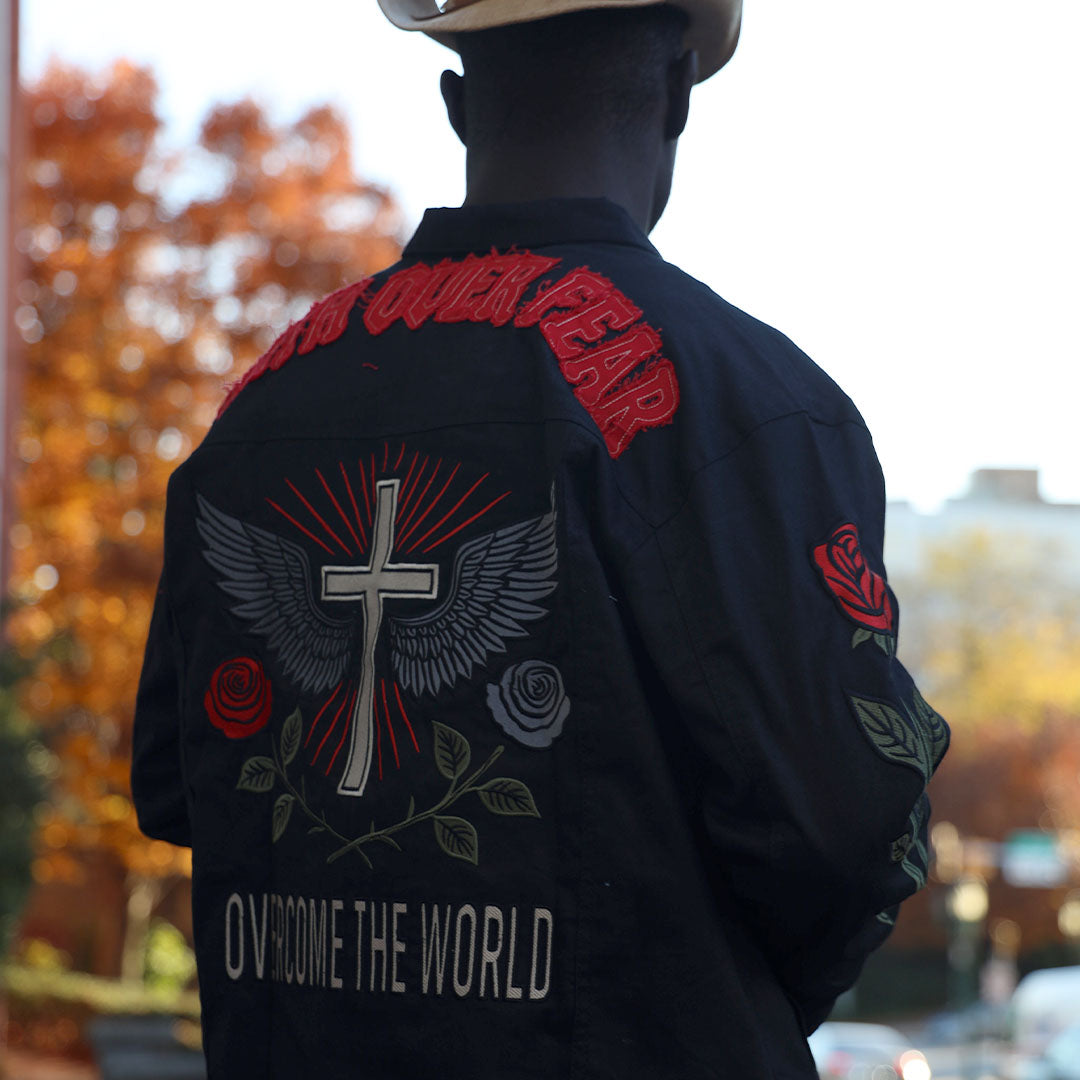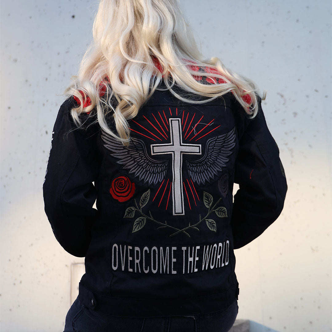 The back features a powerful embroidered cross flanked by wings, symbolizing the battles you’ve risen above. A blooming rose sits beneath—your reminder that beauty grows even from hardship. Bold rays fan outward, capturing the moment light breaks through darkness. Across the bottom, “Overcome The World” declares the message you live by.