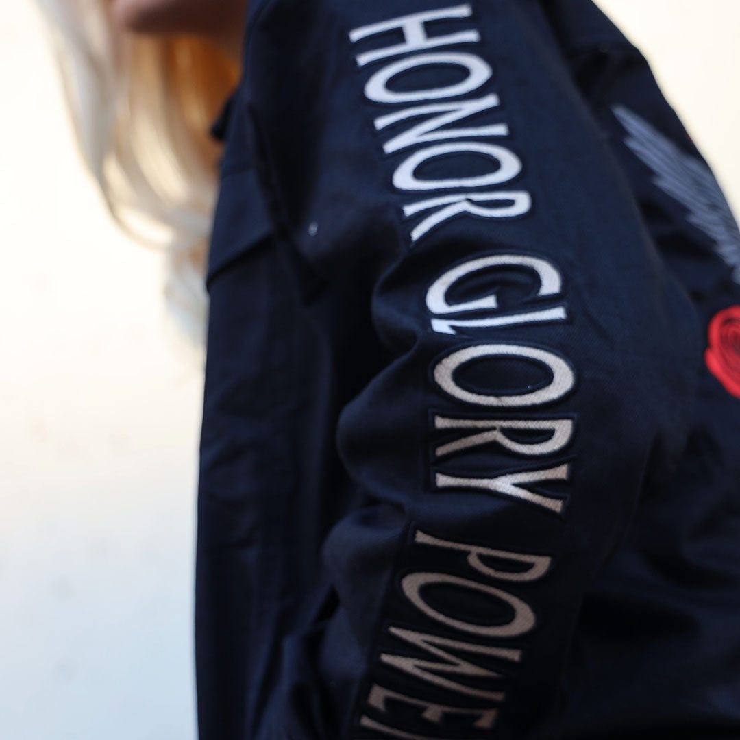 The sleeves carry Honor. Glory. Power. stitched in signature FOF typography—your armor as you walk in purpose. The shoulders feature striking red detailing that frames the entire piece with strength and authority.