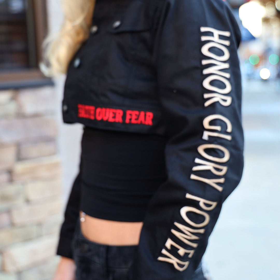The sleeves carry Honor. Glory. Power. stitched in signature FOF typography—your armor as you walk in purpose. The shoulders feature striking red detailing that frames the entire piece with strength and authority.