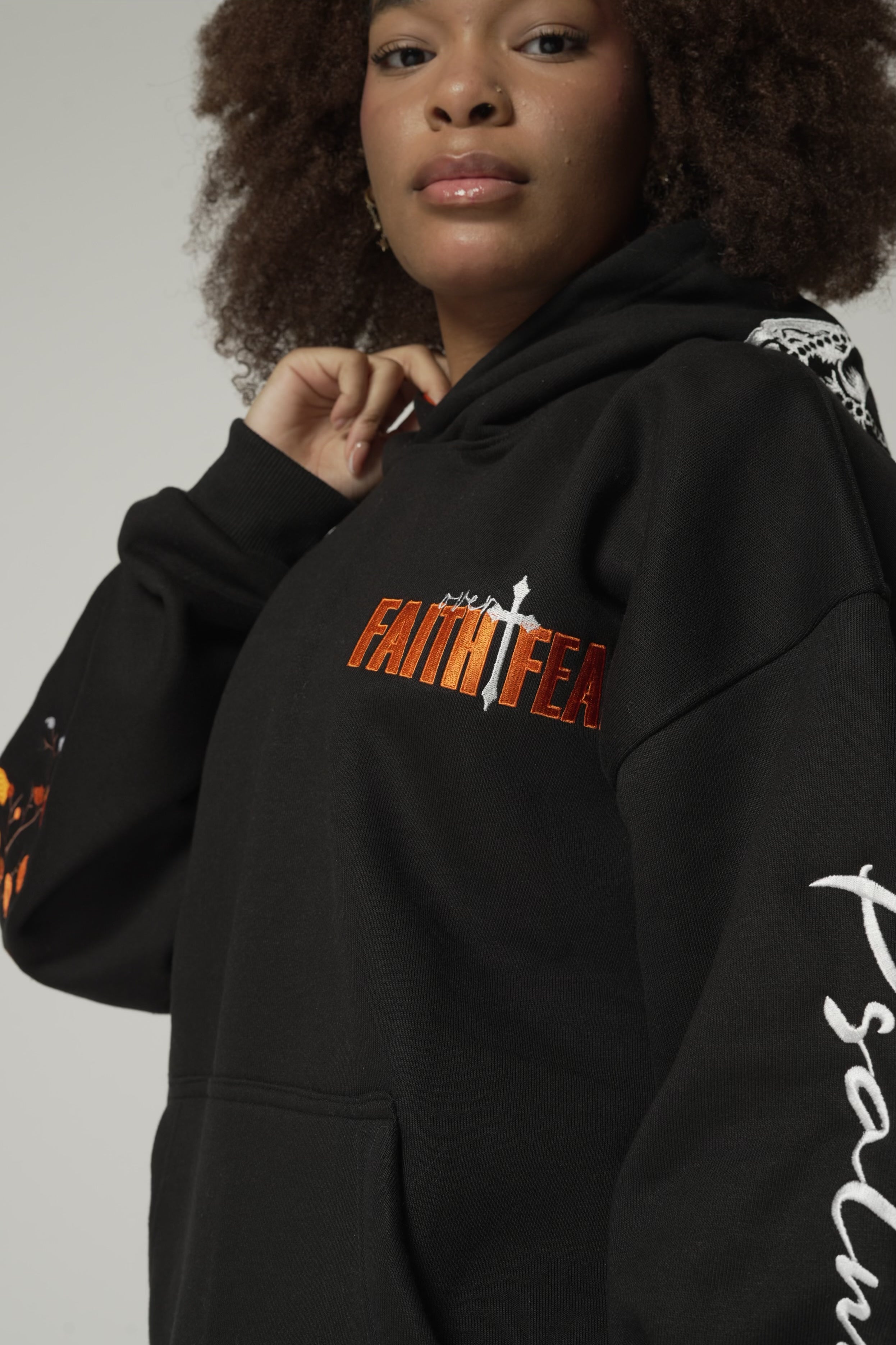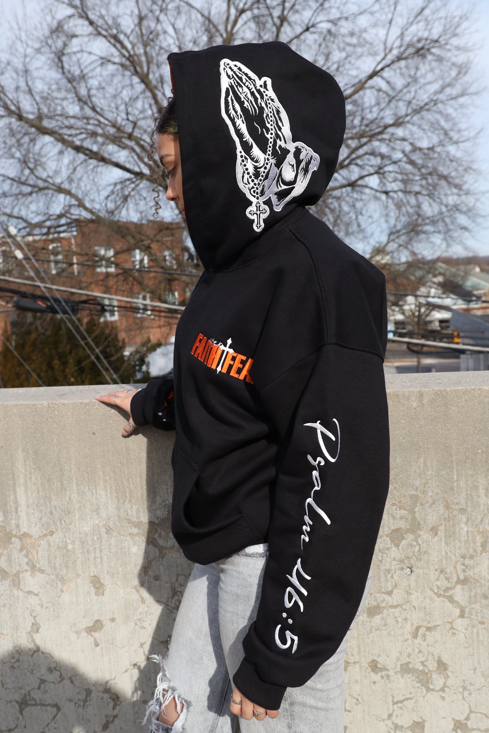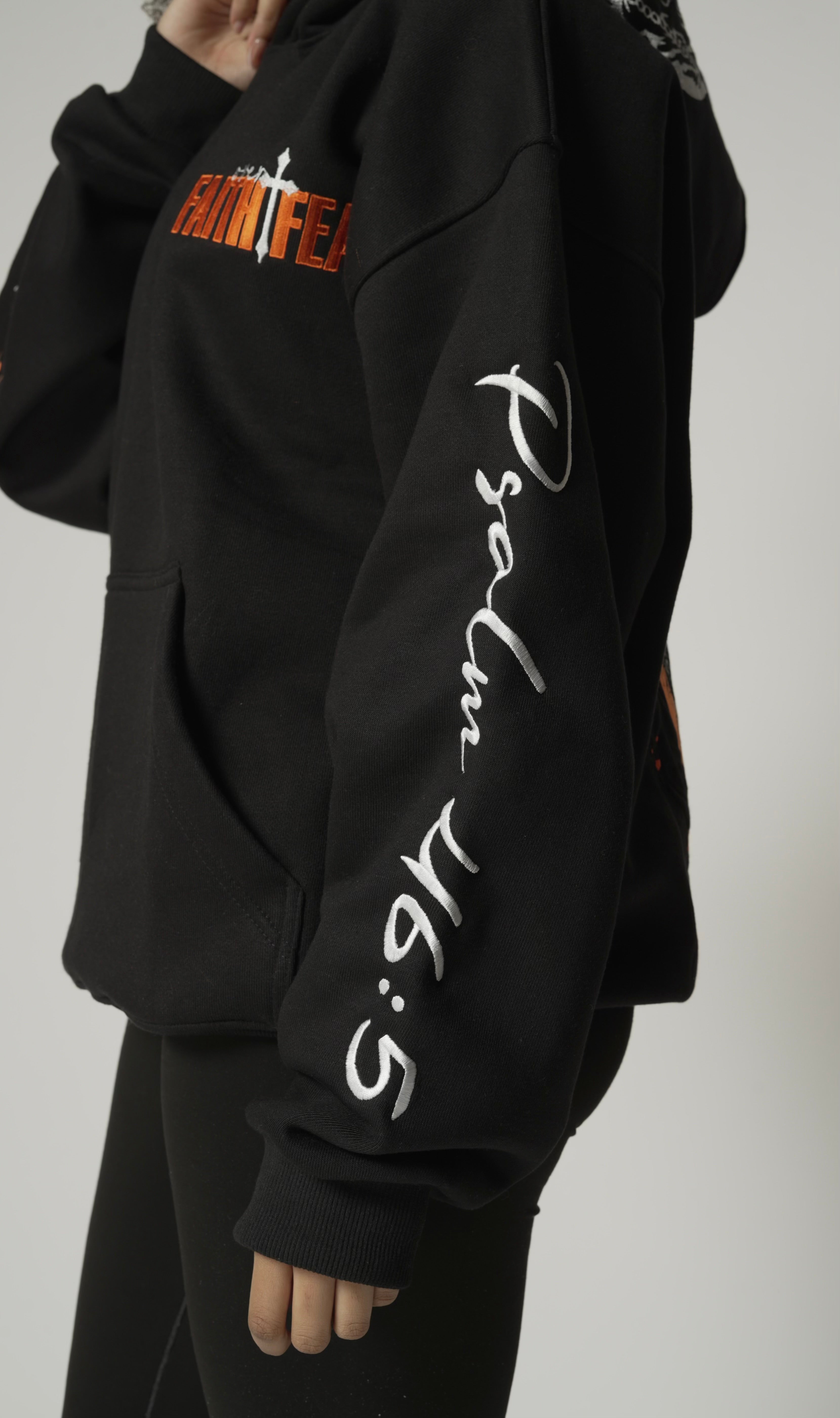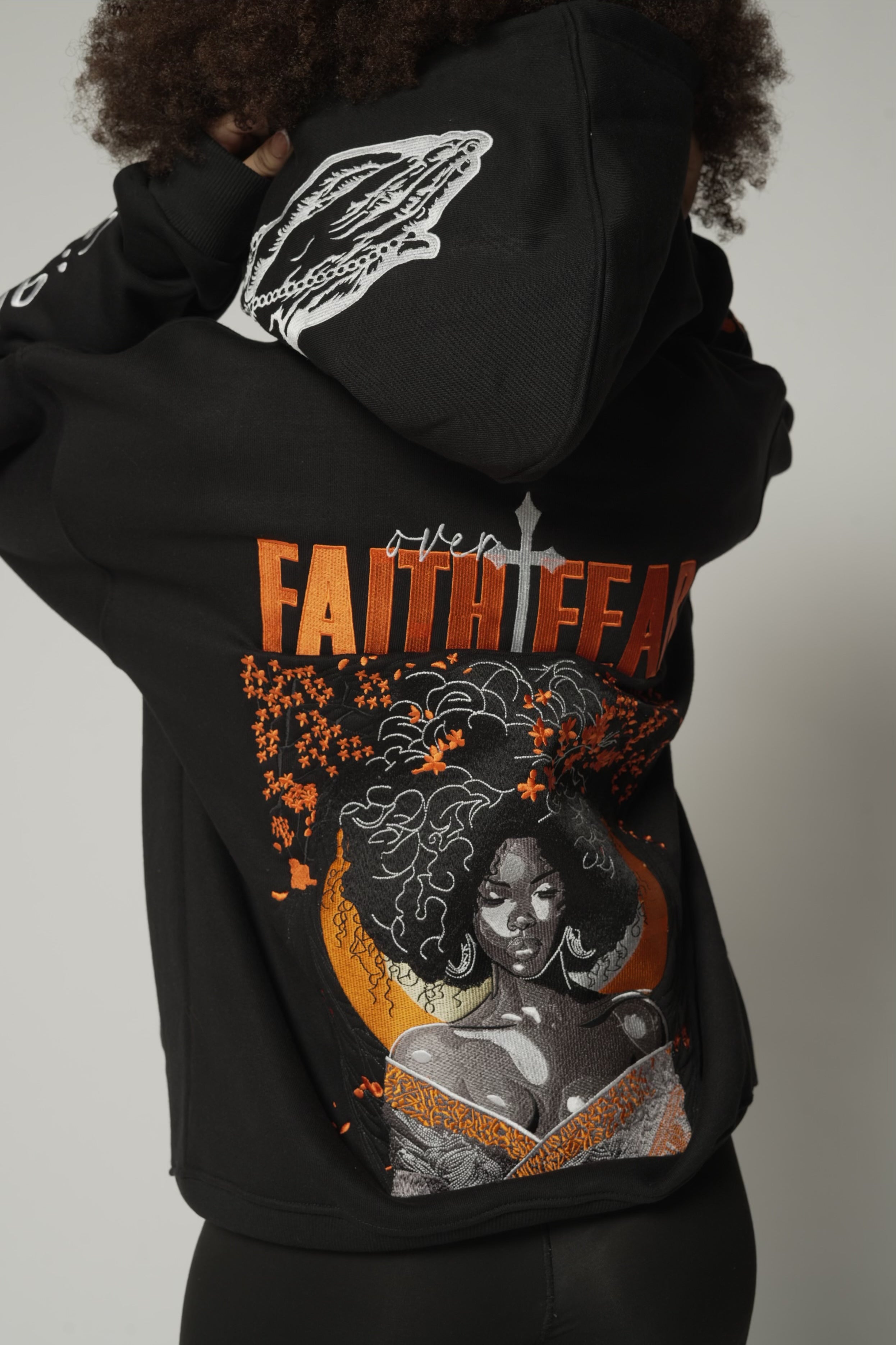 The hood is finished with a praying hands embroidery, symbolizing surrender, faith, and perseverance—because this isn’t just clothing, it’s armor.