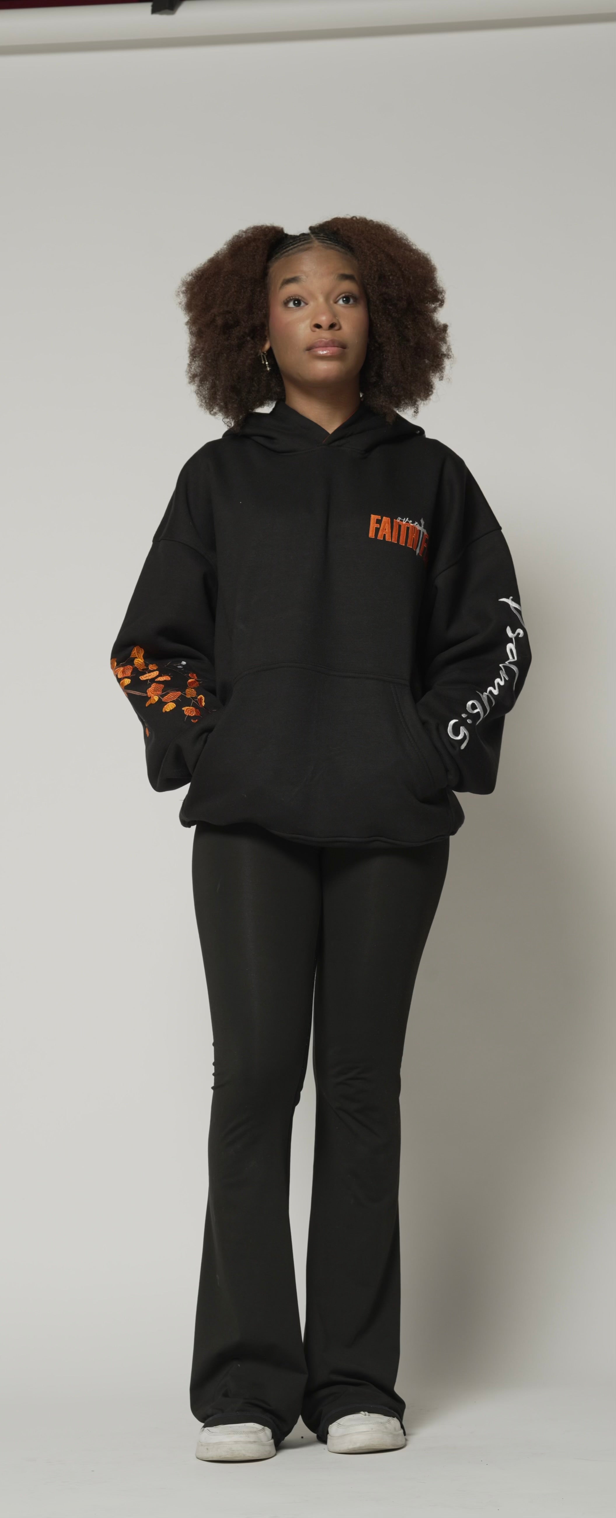 The back artwork brings the message to life: an intricately embroidered portrait surrounded by flowing elements and falling leaves, representing beauty, endurance, and divine protection. Every stitch is layered with intention, creating depth, texture, and movement that separates this hoodie from mass-produced pieces.